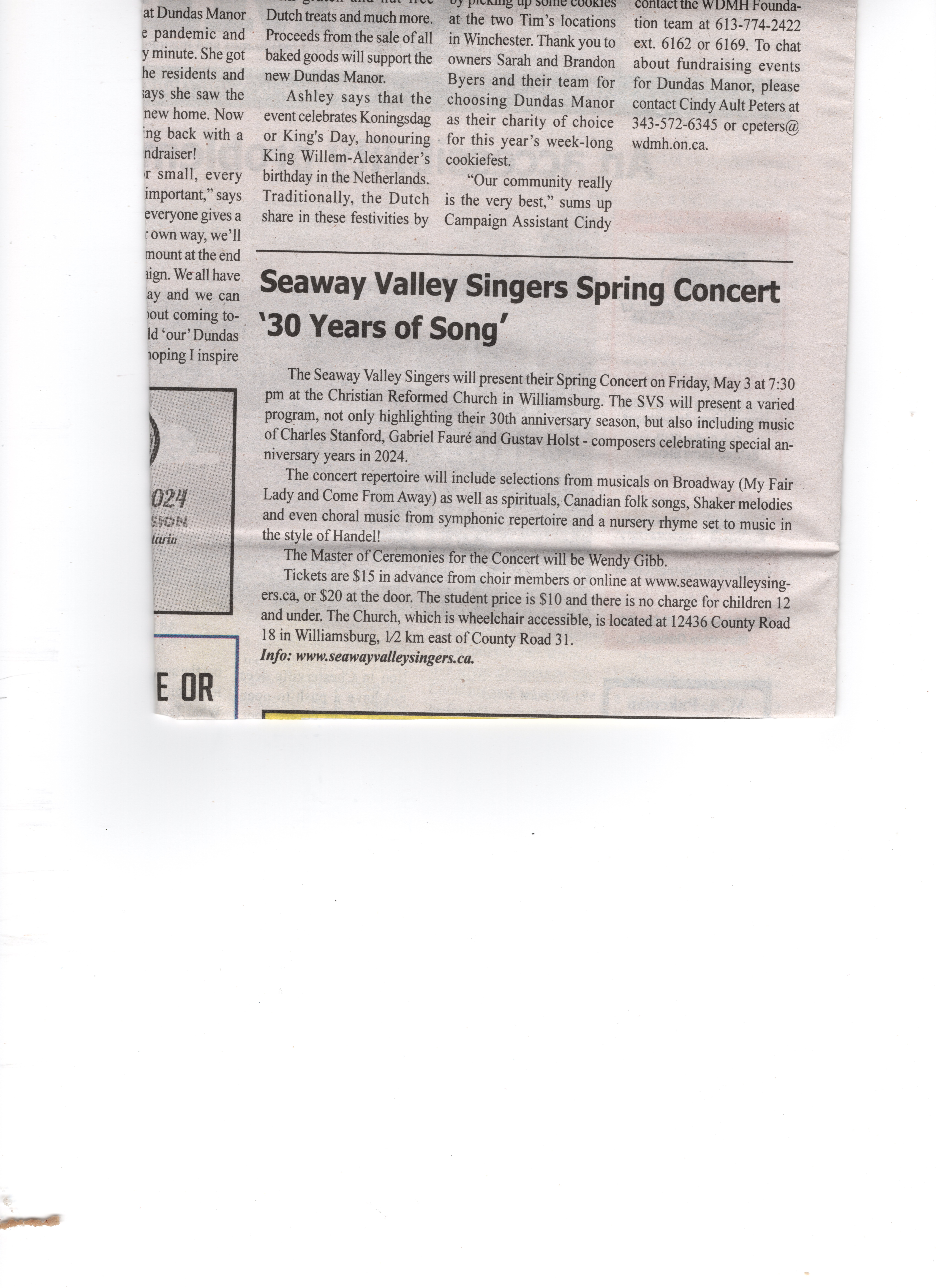2024-05-02 Seaway Valley Singers Spring Concert '30 Years of Song' (North Dundas Times)